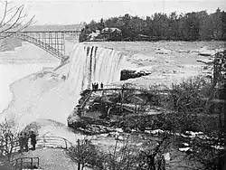 In the 1870s, sightseers had limited access to Niagara Falls and often had to pay for a glimpse, and industrialization threatened to carve up Goat Island to further expand commercial development.[24] Other industrial encroachments and lack of public access led to a conservation movement in the U.S. known as Free Niagara, led by such notables as Hudson River School artist Frederic Edwin Church, landscape designer Frederick Law Olmsted, and architect Henry Hobson Richardson. Church approached Lord Dufferin, governor-general of Canada, with a proposal for international discussions on the establishment of a public park.[25]