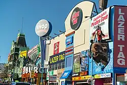 ![]() The skyline of Niagara Falls near the edge of the Horseshoe Falls (at left), including the Skylon Tower, the Fallsview Casino, and several high-rise hotels | |