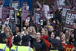 Several months later, the Oxford Union invited Griffin to speak at a forum on the limits of free speech, along with other speakers including David Irving. The invitation was condemned by the Equality and Human Rights Commission head Trevor Phillips and the president of the Oxford Students' Union. The Conservative MP Dr Julian Lewis resigned his membership of the Union.[91] A rally against the invitation was held at Oxford Town Hall on 20 November, and included the Oxford Students' Union president, the National Union of Students black students' officer, and the Trades Union Congress south east regional secretary. Representatives of Unite Against Fascism also attended, as well as the University of Oxford's Jewish student chaplain. Several Holocaust survivors spoke at the rally. Stephen Altmann-Richer, co-president of the Oxford University Jewish Society, said "I don't think these people should be invited to the Oxford Union, by having them speak, it legitimises their views ..."[92] On the night of the debate, about 50 protesters forced their way into the venue, and a crowd of hundreds gathered outside carrying banners bearing anti-racist slogans and voicing anti-BNP chants. Police blocked the entrances to the building, and removed the protesters encamped inside. Griffin was accompanied into the premises by security guards. The event was eventually split between two rooms, with Griffin speaking in one, and Irving in the other; many Union Society members were unable to gain access. Although many present found the debate objectionable, some were supportive of both Griffin and Irving's right to freedom of speech. The Oxford Union later endorsed the debate as a success.[93]