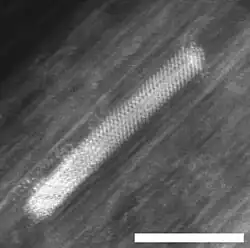 Electron micrograph of a Ni nanocrystal inside a single wall carbon nanotube; scale bar 5 nm[19]