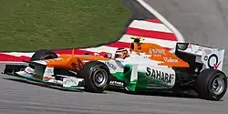 On 16 December 2011, Force India announced di Resta and Hülkenberg would be their drivers for the 2012 season.[20] Hülkenberg qualified ninth for the Australian Grand Prix, six places ahead of di Resta, but his race ended on the first lap after picking up damage in a first-corner incident before retiring further round the course. He picked up his first points for Force India the following weekend, at the Malaysian Grand Prix; he finished in ninth place, having started the race in sixteenth. He again qualified sixteenth, for the Chinese Grand Prix. He achieved his best Formula One finish at the time with a fourth place at the Belgian Grand Prix. He had been running 2nd in the race, when he was jumped by Kimi Räikkönen during the pit stops, before the faster Red Bull of Sebastian Vettel passed them both. Hülkenberg did not score any points in Italy or Singapore, but collected points at all of the next five Grands Prix, except on the Yas Marina Circuit where he was involved in a collision on the first lap, and subsequently retired. This was the first time he scored points in more than two races in a row.