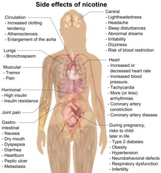 - ^ a b c d e Sinkevicius LV, Sakalauskaite S, Bukovskis M, Lõokene M, Valvere V, Gradauskiene B, et al. (July 2025). "Nicotine from a Different Angle: Biological Effects from a Psychoneuroimmunological Perspective". International Journal of Molecular Sciences. 26 (13): 6437. doi:10.3390/ijms26136437. PMC 12250386. PMID 40650213.