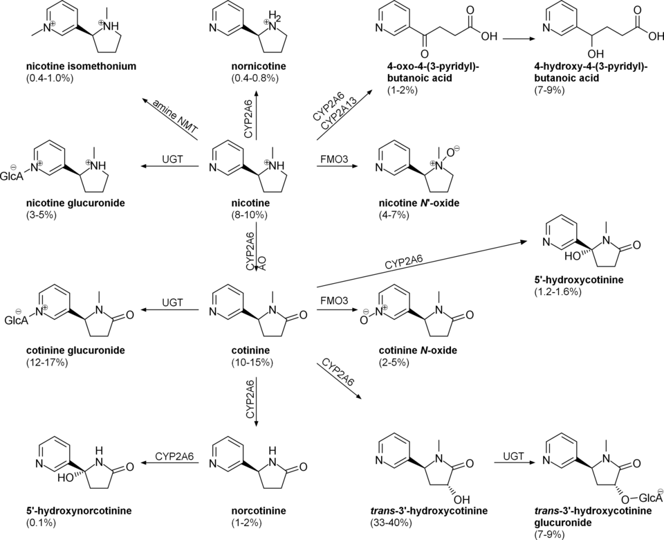 - ^ Hukkanen J, Jacob P, Benowitz NL (March 2005). "Metabolism and disposition kinetics of nicotine". Pharmacological Reviews. 57 (1): 79–115. doi:10.1124/pr.57.1.3. PMID 15734728. S2CID 14374018.