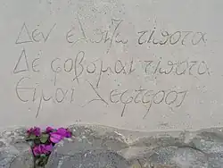 Kazantzakis died on 26 October 1957 in Freiburg at the age of 74. He is buried at the highest point of the Walls of Heraklion, the Martinengo Bastion,[21] looking out over the mountains and sea of Crete. His epitaph reads "I hope for nothing. I fear nothing. I am free." (Δεν ελπίζω τίποτα. Δε φοβούμαι τίποτα. Είμαι λέφτερος.) Kazantzakis developed this famously pithy phrasing of the philosophical ideal of cynicism, which dates back to at least the second century CE.[22]