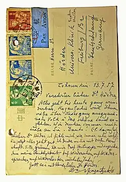 Kazantzakis was anathema to the right-wing in Greece both before and after the Second World War. The right waged war against his books and called him "immoral" and a "Bolshevik troublemaker" and accused him of being a "Russian agent".[27] He was also distrusted by both the Communist Party of Greece and the Soviet Union as a "bourgeois" thinker.[27] However, upon his death in 1957, he was honoured by the Chinese Communist Party as a "great writer" and "devotee of peace."[27] Following the war, he was temporarily leader of a minor Greek leftist party, while in 1945 he was, among others, a founding member of the Greek-Soviet friendship union.