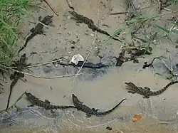 When Nile crocodiles have been entirely free from disturbance in the past, they may nest gregariously with the nest lying so close together that after hatching time the rims of craters are almost contiguous. These communal nesting sites are not known to exist today, perhaps being most recently recorded at Ntoroko peninsula, Uganda where two such sites remaining until 1952. In one area, 17 craters were found in an area of 25 yd × 22 yd (75 ft × 66 ft), in another 24 in an area of 26 yd × 24 yd (78 ft × 72 ft). Communal nesting areas also reported from Lake Victoria (up until the 1930s) and also in the 20th century at Rahad River, Lake Turkana and Malawi.[10][107][108][109] The behaviour of the female Nile crocodile is considered unpredictable and may be driven by the regional extent of prior human disturbance and human persecution rather than natural variability. In some areas, the mother crocodiles will only leave the nest if she needs to cool off (thermoregulation) by taking a quick dip or seeking out a patch of shade.[9] Females will not leave nest site even if rocks are thrown at her back and several authors note her trance-like state while standing near nest, similar to that of crocodiles in aestivation but not like any other stage in their life-cycle. In such a trance, some mother Nile crocodiles may show no discernable reaction even if pelted with stones.[10][9] At other times, the female will fiercely attack anything approaching their eggs, sometimes joined by another crocodile which may be the sire of the young.[9][110] In other areas, the nesting female may disappear upon potential disturbance which may allow the presence of both the female and her buried nest to escape unwanted detection by predators.[15][60] Despite the attentive care of both parents, the nests are often raided by humans and monitor lizards or other animals while she is temporarily absent.[111]