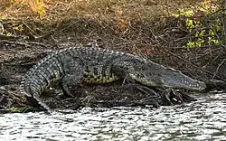 In a study of the morphology of the various populations, including C. (n.) suchus, the appearance of the Nile crocodile sensu lato was found to be more variable than that of any other currently recognized crocodile species, and at least some of these variations were related to locality.[22] For example, a study on Lake Turkana in Kenya (informally this population would be placed in C. n. pauciscutatus) found that the local crocodiles have more osteoderms in their ventral surface than other known populations, and thus are of lesser value in leather trading, accounting for an exceptionally large (possibly overpopulated) local population there in the late 20th century.[23] The segregation of the West African crocodile (C. suchus) from the Nile crocodile has been supported by morphological characteristics,[22][24] studies of genetic materials[21][24] and habitat preferences.[25] The separation of the two is not recognized by the IUCN as their last evaluations of the group was in 2008 and 2009,[2][26] years before the primary publications supporting the distinctiveness of the West African crocodiles.[22][24][25]