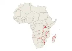 The Nile crocodile's current distribution extends from the regional tributaries of the Nile in Sudan and Lake Nasser in Egypt to the Cunene River in Angola, the Okavango Delta of Botswana, and the Olifants River in South Africa.[66] It is the most common crocodilian in Africa and occurs in Somalia, Ethiopia, Uganda, Kenya, Central African Republic, the Democratic Republic of the Congo, Equatorial Guinea, Tanzania, Rwanda, Burundi, Zambia, Zimbabwe, Gabon, Malawi, Mozambique, Namibia, Sudan, South Sudan and Cameroon.[26] Its historic range extended to the Mediterranean coast in Libya, Tunisia, Algeria, Morocco and across the Red Sea in the Palestine region and Syria. Herodotus sighted it in Lake Moeris in Egypt. It is thought to have become extinct in the Seychelles in the early 19th century. It has rarely been spotted in Zanzibar and the Comoros.[9][33]