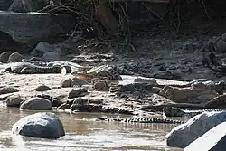 The conservation situation is more grim in Central and West Africa presumably for both the Nile and West African crocodiles. The crocodile population in this area is much more sparse, and has not been adequately surveyed. While the natural population in these areas may be lower due to a less-than-ideal environment and competition with sympatric slender-snouted and dwarf crocodiles, extirpation may be a serious threat in some of these areas.[26][129] At some point in the 20th century, the Nile crocodile appeared to have been extirpated as a breeding species from Egypt, but has locally re-established in some areas such as the Aswan Dam.[23] Additional factors are a loss of wetland habitats, which is addition to direct dredging, damming and irrigation by humans, has retracted in the east, south and north of the crocodile's range, possibly in correlation with global warming.[23][130] Retraction of wetlands due both to direct habitat destruction by humans and environmental factor possibly related to global warming is perhaps linked to the extinction of Nile crocodiles in the last few centuries in Syria, Israel and Tunisia.[23][26] In Lake St. Lucia, highly saline water has been pumped into the already brackish waters due to irrigation practices. Some deaths of crocodiles appeared to have been caused by this dangerous salinity, and this one-time stronghold for breeding crocodiles has experienced a major population decline.[23][131] In yet another historic crocodile stronghold, the Olifants River, which flows through Kruger National Park, numerous crocodile deaths have been reported. These are officially due to unknown causes but analysis has indicated that environmental pollutants caused by humans, particularly the burgeoning coal industry, are the primary cause. Much of the contamination of crocodiles occurs when they consume fish themselves killed by pollutants.[132][133] Additional ecological surveys and establishing management programs are necessary to resolve these questions.