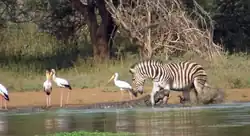 Predators of Nile crocodiles eggs have ranged from insects such as the red flour beetle (Tribolium castaneum) to predators as large and formidable as spotted hyenas (Crocuta crocuta).[116] Unsurprisingly, once exposed to the elements as hatchlings, the young, small Nile crocodiles are even more vulnerable. Most of the predators of eggs also opportunistically eat young crocodiles, including monitors and marabous, plus almost all co-existing raptorial birds, including vultures, eagles, and large owls and buzzards. Many "large waders" are virulent predators of crocodile hatchlings, from dainty little egrets (Egretta garzetta) and compact hamerkops (Scopus umbretta) to towering saddle-billed storks (Ephippiorhynchus senegalensis), goliath herons and shoebills (Balaeniceps rex). Larger corvids and some non-wading water birds (i.e. pelicans) can also take some young Nile crocodiles. Mammalian carnivores take many hatchlings as well as large turtles and snakes, large predatory freshwater fish, such as the African tigerfish, the introduced largemouth bass, and possibly bull sharks, when they enter river systems. When crocodile nests are dug out and the young placed in water by the mother, in areas such as Royal Natal National Park predators can essentially enter a feeding frenzy.[116][117][118][119] It may take a few years before predation is no longer a major cause of mortality for young crocodiles. African fish eagles can take crocodile hatchlings up to a few months of age and honey badgers can prey on yearlings. Once they reach their juvenile stage, large African rock pythons and big cats remain as the only predatory threat to young crocodiles.[8][9][120] Perhaps no predator is more deadly to young Nile crocodiles than larger crocodiles of their own species, as, like most crocodilians, they are cannibalistic. This species may be particularly dangerous to their own kind considering their aggressive dispositions.[9][86][121] While the mother crocodile will react aggressively toward potential predators and has been recorded chasing and occasionally catching and killing such interlopers into her range, due to the sheer number of animals who feed on baby crocodiles and the large number of hatchlings, she is more often unsuccessful at deflecting such predators.[10][9][116]