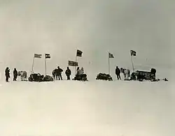 On Boxing Day the glacier ascent was at last completed, and the march on the polar plateau began. Conditions did not ease; Shackleton recorded 31 December as the "hardest day we have had".[63] On the next day he noted that, having attained 87° 6½′ S, they had beaten North and South polar records.[64] That day, referring to Marshall and Adams, Wild wrote: "if we only had Joyce and Marston here instead of those two grubscoffing useless beggars we would have done it [the Pole] easily."[65] On 4 January 1909, Shackleton finally accepted that the Pole was beyond them and revised his goal to the symbolic achievement of getting within 100 geographical miles of the Pole.[66] The party struggled on, at the borders of survival,[67] until on 9 January 1909, after a last dash forward without the sledge or other equipment, the march ended. "We have shot our bolt", wrote Shackleton, "and the tale is 88° 23' S".[68] They were 97.5 geographical miles from the South Pole. The Union Jack was duly planted, and Shackleton named the polar plateau after King Edward VII.[g]