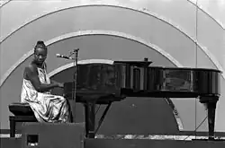 Simone's bearing and stage presence earned her the title "the High Priestess of Soul".[89] She was a pianist, singer and performer, "separately, and simultaneously". As a composer and arranger, Simone moved from gospel to blues, jazz, and folk, and to numbers with European classical styling. Besides using Bach-style counterpoint, she called upon the particular virtuosity of the 19th-century Romantic piano repertoire—Chopin, Liszt, Rachmaninoff, and others.[90] Jazz trumpeter Miles Davis spoke highly of Simone, deeply impressed by her ability to play three-part counterpoint and incorporate it into pop songs and improvisation.[30] Onstage, she incorporated monologues and dialogues with the audience into the program, and often used silence as a musical element.[91] Throughout most of her life and recording career she was accompanied by percussionist Leopoldo Fleming and guitarist and musical director Al Schackman.[92] She was known to pay close attention to the design and acoustics of each venue, tailoring her performances to individual venues.[30] Rolling Stone once said that Simone could "channel every facet of lived experience." Simone was often credited for her ability to express an expansive emotional range in her music, from immeasurable rage to limitless joy.[93]