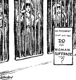 In 1914 the constitutional amendment proposed by Sargent, which was nicknamed the "Susan B. Anthony Amendment", was once again considered by the Senate, where it was again rejected.[28] In April 1917 the "Anthony Amendment", which eventually became the Nineteenth Amendment, was reintroduced in the House and Senate. Picketing NWP members, nicknamed the "Silent Sentinels", continued their protests on the sidewalks outside the White House. On July 4, 1917, police arrested 168 of the protesters, who were sent to prison in Lorton, Virginia. Some of these women, including Lucy Burns and Alice Paul, went on hunger strikes; some were force-fed while others were otherwise harshly treated by prison guards. The release of the women a few months later was largely due to increasing public pressure.[45]