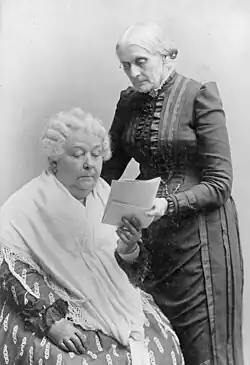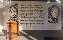 While scattered movements and organizations dedicated to women's rights existed previously, the 1848 Seneca Falls Convention in New York is traditionally held as the start of the American women's rights movement. Attended by nearly 300 women and men, the convention was designed to "discuss the social, civil, and religious rights of women", and culminated in the adoption of the Declaration of Sentiments.[4] Signed by 68 women and 32 men, the ninth of the document's twelve resolved clauses reads, "Resolved, That it is the duty of the women of this country to secure to themselves their sacred right to the elective franchise."[5] Conveners Lucretia Mott and Elizabeth Cady Stanton became key early leaders in the U.S. women's suffrage movement, often referred to at the time as the "woman suffrage movement".[6][7] Mott's support of women's suffrage stemmed from a summer spent with the Seneca Nation, one of the six tribes in the Iroquois Confederacy, where women had significant political power, including the right to choose and remove chiefs and veto acts of war.[8]