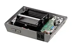 As development progressed on the new video game system, engineers sought Yamauchi's guidance on its features. They questioned whether to include a disk drive, keyboard, data port, as well as the potential for a modem, expanded memory, and other computer-like capabilities. Yamauchi ultimately instructed Uemura to prioritize simplicity and affordability, omitting these peripherals entirely. Game cartridges, which Uemura saw as "less intimidating" to consumers, were chosen as the format.[26] The team designed the system with 2,000 bytes of random-access memory (RAM).[27]