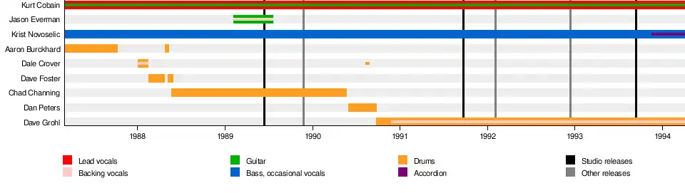 Singer and guitarist Kurt Cobain and bassist Krist Novoselic met while attending Aberdeen High School in Washington state.[8] The pair became friends while frequenting the practice space of the Melvins.[9] Cobain wanted to form a band with Novoselic, but Novoselic did not respond for a long period. Cobain gave him a demo tape of his project Fecal Matter. Three years after the two first met, Novoselic notified Cobain that he had finally listened to the Fecal Matter demo and suggested they start a group. Their first band, the Sellouts, was a Creedence Clearwater Revival tribute band.[10] The project featured Novoselic on guitar and vocals, Cobain on drums, and Steve Newman on bass but only lasted a short time.[11] Another project, this time featuring originals, was also attempted in late 1986. Bob McFadden was enlisted to play drums, but after a month this project also fell through.[12] In early 1987, Cobain and Novoselic recruited drummer Aaron Burckhard.[13] They practiced material from Cobain's Fecal Matter tape but started writing new material soon after forming.[14]