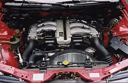 The 2,960 cc (3.0 L) VG30DE V6 engine was carried over from the previous generation 300ZX (Z31), but fitted with a DOHC head and variable valve timing (N-VCT), producing 222 bhp (225 PS; 166 kW) at 6,400 rpm and 198 lb⋅ft (268 N⋅m) at 4,800 rpm in naturally aspirated (NA) form.[35] During instrumented testing conducted by Car and Driver in 1989, the NA car recorded a time of 6.7 seconds to accelerate from 0 to 60 mph (97 km/h), an elapsed time of 15.0 seconds over 1⁄4 mi (0.40 km) with a trap speed of 93 mph (150 km/h), and a maximum speed of 143 mph (230 km/h).[35]