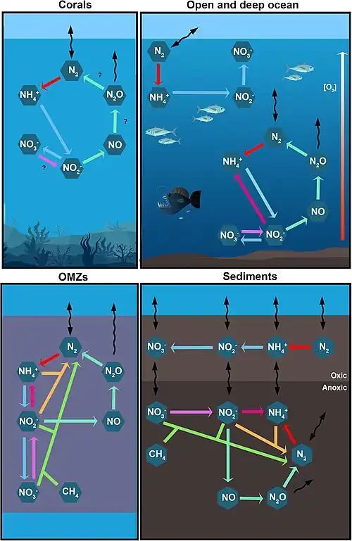 - ^ Pajares Moreno, S.; Ramos, R. (2019). "Processes and Microorganisms Involved in the Marine Nitrogen Cycle: Knowledge and Gaps". Frontiers in Marine Science. 6 739. Bibcode:2019FrMaS...6..739P. doi:10.3389/fmars.2019.00739.