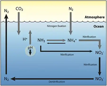 - ^ a b Voss, M.; Bange, H. W.; Dippner, J. W.; Middelburg, J. J.; Montoya, J. P.; Ward, B. (2013). "The marine nitrogen cycle: recent discoveries, uncertainties and the potential relevance of climate change". Philosophical Transactions of the Royal Society B: Biological Sciences. 368 (1621) 20130121. doi:10.1098/rstb.2013.0121. PMC 3682741. PMID 23713119.