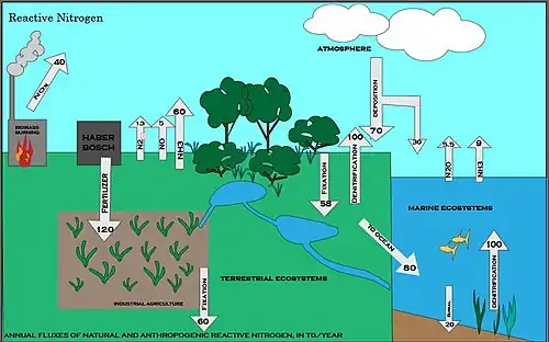 - ^ a b Fowler, David; Coyle, Mhairi; Skiba, Ute; Sutton, Mark A.; Cape, J. Neil; Reis, Stefan; Sheppard, Lucy J.; Jenkins, Alan; Grizzetti, Bruna; Galloway, JN; Vitousek, P; Leach, A; Bouwman, AF; Butterbach-Bahl, K; Dentener, F; Stevenson, D; Amann, M; Voss, M (5 July 2013). "The global nitrogen cycle in the twenty-first century". Philosophical Transactions of the Royal Society of London. Series B, Biological Sciences. 368 (1621) 20130164. doi:10.1098/rstb.2013.0164. PMC 3682748. PMID 23713126.