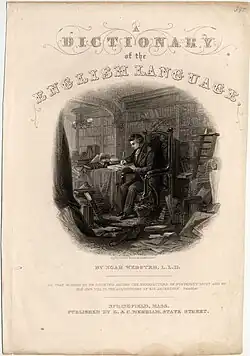 Webster completed his dictionary during his year abroad in January 1825 in a boarding house in Cambridge, England.[48] His book contained seventy thousand words, of which twelve thousand had never appeared in a published dictionary before. As a spelling reformer, Webster preferred spellings that matched pronunciation better. In A Companion to the American Revolution (2008), John Algeo notes: "It is often assumed that characteristically American spellings were invented by Noah Webster. He was very influential in popularizing certain spellings in America, but he did not originate them. Rather ... he chose already existing options such as center, color and check on such grounds as simplicity, analogy or etymology."[36] He also added American words, like "skunk", that did not appear in British dictionaries. At the age of seventy, Webster published his dictionary in 1828, registering the copyright on April 14.[49]