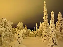 Light pollution on a ski slope in Finland gives the area a hazy, brightened sky.