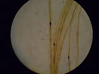 ![]() Drawing of a peripheral nerve axon (labeled "axis cylinder"), showing a node of Ranvier along with other features | |