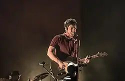 Gallagher said he wrote Oasis' first single, "Supersonic", in "the time it takes to play the song".[20] "Supersonic" was released in early 1994 and peaked at No. 31 on the official UK charts. The single was later followed by Oasis' debut album Definitely Maybe, which was released in August 1994 and was a critical and commercial success. It became the fastest-selling debut album in British history at the time and entered the UK charts at number one.[29] Despite their rapidly growing popularity, Gallagher briefly left Oasis in 1994 during their first American tour. The conditions were poor, and he felt the American audience—still preoccupied with grunge and metal—did not understand the band.[30] Gallagher stated that his early songs, especially "Live Forever", were written to refute grunge's pessimism.[31] Tensions mounted between him and Liam, culminating in a fight after a disastrous gig in Los Angeles.[20] Having effectively decided to quit the music industry, he flew to San Francisco without telling the band, management or the crew. It was during this time that Gallagher wrote "Talk Tonight" as a "thank you" for the girl he stayed with, who "talked him from off the ledge". He was tracked down by Creation's Tim Abbot, and during a trip by the pair to Las Vegas, Gallagher decided to continue with the band. He reconciled with his brother and the tour resumed in Minneapolis.[32]