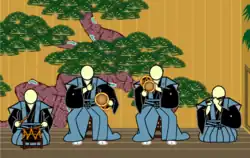 The musicians and chorus typically wear formal montsuki kimono (black and adorned with five family crests) accompanied by either hakama (a skirt-like garment) or kami-shimo, a combination of hakama and a waist-coat with exaggerated shoulders. Finally, the stage attendants are garbed in virtually unadorned black garments, much in the same way as stagehands in contemporary Western theatre.[12]