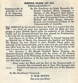 Norfolk Island Act 1913 Proclamation, effective 1 July 1914