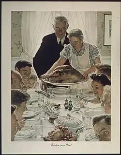 In 1943, during World War II, Rockwell painted the Four Freedoms series, which was completed in seven months and resulted in him losing fifteen pounds. The series was inspired by a speech by Franklin D. Roosevelt, wherein Roosevelt described and articulated Four Freedoms for universal rights. Rockwell then painted Freedom from Want, Freedom of Speech, Freedom of Worship[33] and Freedom from Fear.[34]