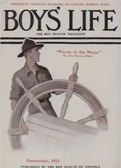 After that, Rockwell was hired as a staff artist for Boys' Life. In this role, he received 50 dollars' compensation each month for one completed cover and a set of story illustrations. It is said to have been his first paying job as an artist.[27] At 19, Rockwell became the art editor for Boys' Life, published by the Boy Scouts of America. He held the job for three years,[28] during which Rockwell painted several covers, beginning with his first published magazine cover, Scout at Ship's Wheel, which appeared on the Boys' Life September 1913 edition.