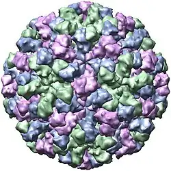Viruses in Norovirus are non-enveloped, with icosahedral geometries. Capsid diameters vary widely, from 23 to 40 nm in diameter. The larger capsids (38–40 nm) exhibit T=3 symmetry and are composed of 180 VP1 proteins. Small capsids (23 nm) show T=1 symmetry, and are composed of 60 VP1 proteins.[37] The virus particles demonstrate an amorphous surface structure when visualized using electron microscopy.[38]