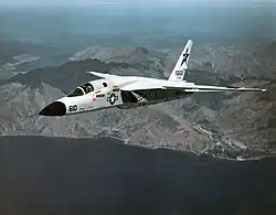 During the mid-1950s, the notion of a nuclear-armed aircraft capable of speeds of up to Mach 2 was considered to be quite ambitious, and only more so for that same aircraft to be operable under the unavoidable constraints imposed by aircraft carrier operations.[2] In terms of its basic configuration, the conceptual aircraft featured twin-engines and high-mounted wing, as did the XA2J, but differed substantially by being highly swept and adopting jet propulsion. According to aviation authors Bill Gunston and Peter Gilchrist, NAA's design incorporated numerous advanced technology features, such as being the first supersonic bomber to be designed with a slim forward fuselage, as well as being the first with fully-variable wedge-type side air intakes.[6] The company's preliminary design studies had been typically centered around a twin vertical fin/rudder arrangement, but this was substituted for a single large all-moving vertical fin as design definition proceeded.[4][7]
