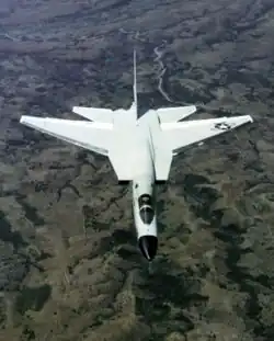 Two widely spaced General Electric J79 turbojet engines were supplied with air through inlets with variable intake ramps.[4][13] While the same engine was used by several other US military aircraft, such as the Convair B-58 Hustler and the McDonnell Douglas F-4 Phantom II, the powerplants used on the A-5 differed in some ways, such as the use of a somewhat uncommon air-impingement starter along with a single igniter. Both engines were equipped with constant-speed drives for alternators to generate a steady 30 kVA for the onboard electrical systems, a hydraulically-driven emergency supply generated by a ram air turbine was also installed.[11] The visibly slant intake design was first used on the A-5 Vigilante but later become commonplace on military aircraft such the Tupolev Tu-22 bomber, Grumman F-14 Tomcat, MiG-25 and McDonnell Douglas F-15 Eagle fighter aircraft.