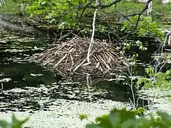 The purpose of the dam is to create a deepwater refuge enabling the beaver to escape from predators. When deep water is already present in lakes, rivers, or larger streams, the beaver may dwell in a bank burrow and bank lodge with an underwater entrance. The beaver dam is constructed using branches from trees the beavers cut down, as well as rocks, grass, and mud. Where naturally occurring woody material is limiting, beavers may build their dams largely of rocks.[66] The inner bark, twigs, shoots, and leaves of such trees are also an important part of the beaver's diet.[67] The trees are cut down using their strong incisor teeth. Their front paws are used for digging and carrying and placing materials. The sound of running water dictates when and where a beaver builds its dam. Besides providing a safe home for the beaver, beaver ponds also provide habitat for waterfowl, fish, and other aquatic animals. Their dams help reduce soil erosion and can help reduce flooding. However, beaver dams are not permanent and depend on the beavers' continued presence for their maintenance. Beavers generally concentrate on building and repairing dams in the fall in preparation for the coming winter. In northern areas, they often do not repair breaches in the dam made by otters, and sometimes breach the dam themselves and lower the water level in the pond to create more breathing space under the ice or get easier access to trees below the dam. In a 1988 study in Alberta, Canada, no beavers repaired "sites of water loss" during the winter. Of 178 sites of water loss, beavers repaired 78 when water was opened, and did not repair 68. The rest were partially repaired.[68]