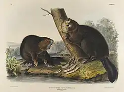 The most widespread (formerly recognized) subspecies, which perhaps are now best thought of as populations with some distinct physical characteristics, are C. c. acadicus (New England beaver), C. c. canadensis (Canadian beaver), C. c. carolinensis (Carolina beaver), and C. c. missouriensis (Missouri River beaver).[33] The Canadian beaver originally inhabited almost all of the forested area of Canada,[34] and because of its more valued fur, was often selected for reintroductions elsewhere. The Carolina beaver is found in the southeastern United States; the Missouri River beaver, as its name suggests, is found in the Missouri River and its tributaries; and C. c. acadicus is found throughout the New England area in the northeastern United States.