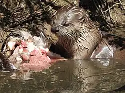 The diet of the North American river otter can be deduced by analyzing either stool obtained in the field,[41] or gut contents removed from trapped otters.[42] Fish are the primary component of the North American river otter's diet throughout the year.[43] Every study done on the food habits of the North American river otter has identified varying fish species as being the primary component of its diet. For instance, an Alberta, Canada study involved the collection and analysis of 1,191 samples of North American river otter scat (feces) collected during each season.[44] Fish remnants were found in 91.9% of the samples. Moreover, a western Oregon study revealed fish remains were present in 80% of the 103 digestive tracts examined.[43] Crustaceans (crayfish), where regionally available, are the second-most important prey for otters. Crustaceans may even be consumed more than fish. For example, a study conducted in a central California marshland indicated crayfish formed nearly 100% of the river otter's diet at certain times of the year.[45] However, North American river otters, as foragers, will immediately take advantage of other prey when readily obtainable.[46] Other prey consumed by North American river otters includes fruits, aquatic plants, reptiles, amphibians, birds (most especially moulting ducks which render the birds flightless and thus makes them easier to capture), aquatic insects, small mammals, and mollusks.[23][38][47] North American river otters are not scavengers; they avoid consuming carrion (dead animals).[40][48] North American river otters do not generally handle prey of a large size relative to themselves but there are occasions where they have been observed ambushing and killing adult common snapping turtles while the large turtles (which are roughly equal in average body weight to a North American river otter) are hibernating.[49] Remains of the much larger North American beaver have been found in North American river otter scat in some regions, although most otter dietary studies in areas where otters and beaver live near each other do not show them to be regular predators of beavers (despite the claims of fur-trappers that otters frequently hunt beavers) and perhaps only young beaver kits may be attacked.[48][44]: 1306