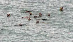 Waterfowl, rails, and some colonial nesting birds are preyed upon by North American river otters in various areas.[42][55] Susceptibility of these species is greatest during the summer (when waterfowl broods are vulnerable) and autumn.[42] The North American river otters have also been known to catch and consume moulting American wigeon (Mareca americana) and green-winged teal (Anas crecca).[44] Other species of birds found within their diets include: northern pintail (Anas carolinensis); mallard (Anas platyrhynchos); canvasback (Aythya valisineria); ruddy duck (Oxyura jamaicensis); and the American coot (Fulica americana).[43]
