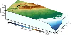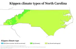 North Carolina is defined by a wide range of elevations and landscapes. From west to east, North Carolina's elevation descends from the Appalachian Mountains to the Piedmont and Atlantic coastal plain. North Carolina's Mount Mitchell at 6,684 ft (2,037 m) is the highest point in North America east of the Black Hills South Dakota.[16] Most of the state falls in the humid subtropical climate zone; however, the western, mountainous part of the state has a subtropical highland climate.[17]