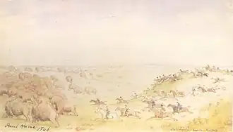 Due to attacks by Crees, Assiniboines and Chippewas armed with firearms, they left the area around 1780 and crossed Missouri some time after.[13] A band of the few Sotaio Indians lived east of Missouri River and met the uprooted Cheyennes before the end of the century. They soon followed the Cheyennes across Missouri and lived among them south of Cannonball River.[14]