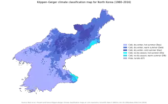 North Korea experiences a humid continental climate within the Köppen climate classification scheme. Winters bring clear weather interspersed with snow storms as a result of northern and northwestern winds that blow from Siberia.[161] Summer tends to be by far the hottest, most humid, and rainiest time of year because of the southern and southeastern monsoon winds that carry moist air from the Pacific Ocean. Approximately 60 percent of all precipitation occurs from June to September.[161] Spring and autumn are transitional seasons between summer and winter. The daily average high and low temperatures for Pyongyang are −3 and −13 °C (27 and 9 °F) in January and 29 and 20 °C (84 and 68 °F) in August.[161]