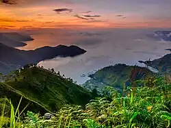 Lake Toba is the site of a supervolcanic eruption that occurred 69,000 to 77,000 years ago, estimated at VEI 8, that formed a climate-changing event.[35] Recent advances in dating methods suggest more precise dating at 74,000 years ago.[36] It is the largest-known explosive eruption on Earth in the last 25 million years. It has been accepted that the eruption of the Toba Caldera led to a volcanic winter with a worldwide decrease in temperatures between 3 and 5 °C (5.4 and 9.0 °F), and up to 15 °C (27 °F) in higher latitudes. Additional studies in Lake Malawi in East Africa show significant amounts of ash deposited by the Toba Caldera eruptions, despite a great distance from the area, but these studies offer little indication of a significant climatic effect in East Africa.[37] According to the Toba catastrophe theory, the eruption killed most humans living at that time and is believed to have created a population bottleneck in central East Africa and India, affecting the human genome to the present day.[38] More recent studies have cast doubt on this theory and found no evidence of substantial changes in population.[39]
