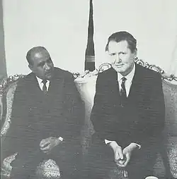 In June 1961, Ahmad was still recovering from an assassination attempted four months prior, and moved out of the capital, Taiz, into the pleasure palace of Sala. Defense and foreign minister, Badr became acting prime minister and interior minister. Despite being crown prince, al-Badr still needed the Ulema in San'a to ratify him. Al-Badr was not popular with the Ulema due to his association with Nasser, and the Ulema had refused Ahmad's request to ratify Badr's title.[21] Imam Ahmad died on September 19, 1962, and was succeeded by his son, Muhammad al-Badr.[3] One of al-Badr's first acts was to appoint Colonel Abdullah Sallal, a known socialist and Nasserist, as commander of the palace guard.[17]