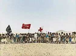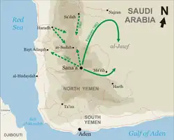 The Ramadan offensive began in February 1963 when Amer and Sadat arrived in San'a. Amer asked Cairo to double the 20,000 men in Yemen, and, in early February, the first 5,000 of the reinforcements arrived. On February 18, a task force of 15 tanks, 20 armored cars, 18 trucks and numerous jeeps departed San'a' moving northwards, heading for Sadah. More garrison troops followed. A few days later, another task force, spearheaded by 350 men in tanks and armored cars, left Sadah heading southeast toward Marib. They maneuvered into the Rub al-Khali desert, perhaps well into Saudi territory, and there the forces were built up by an airlift. Then they headed west. On February 25, the forces occupied Marib, and on March 7 they took Harib. A royalist force of 1,500 men ordered down from Najran failed to stop them on their way out from Sadah. The royalist commander at Harib fled to Beihan, on the British-protected side of the border.[45] In the battle of El-Argoup, 25 miles (40 km) southeast of San'a, 500 royalists under Prince Abdullah's command attacked an Egyptian position on top of a sheer-sided hill that was fortified with six Soviet T-54 tanks, a dozen armored cars and entrenched machine guns. The royalists advanced in a thin skirmish line and were plastered by artillery, mortars, and strafing planes. They replied with rifles, one mortar with twenty rounds, and a bazooka with four rounds. The battle lasted a week and cost the Egyptians three tanks, seven armored cars, and 160 dead.[46] The Egyptians were now in positions from which they could hope to interdict the royalist movement of supplies in the mountains north and east of San'a'.[45]