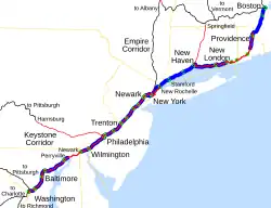 The Northeast Corridor (NEC) is an electrified railroad line in the Northeast megalopolis of the United States. Owned primarily by Amtrak, it runs from Boston in the north to Washington, D.C., in the south, with major stops in Providence, New Haven, Stamford, New York City, Newark, Trenton, Philadelphia, Wilmington, and Baltimore. The NEC is roughly paralleled by Interstate 95 for most of its length. Carrying more than 2,200 trains a day,[2] it is the busiest passenger rail line in the United States by ridership and service frequency.[3]