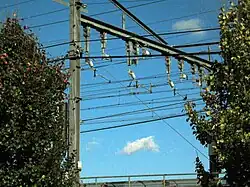 In 1905, the PRR began to electrify its suburban lines at Philadelphia: an effort that eventually led to 11 kV, 25 Hz AC catenary from New York and Washington.[34] Electric service began in September 1915, with multiple unit trains west to Paoli on the PRR Main Line (now the Keystone Corridor).[35] Electric service to Chestnut Hill (now the Chestnut Hill West Line), including a stretch of the NEC, began on March 30, 1918. Local electric service to Wilmington, Delaware, on the NEC began on September 30, 1928, and to Trenton, New Jersey, on June 29, 1930.