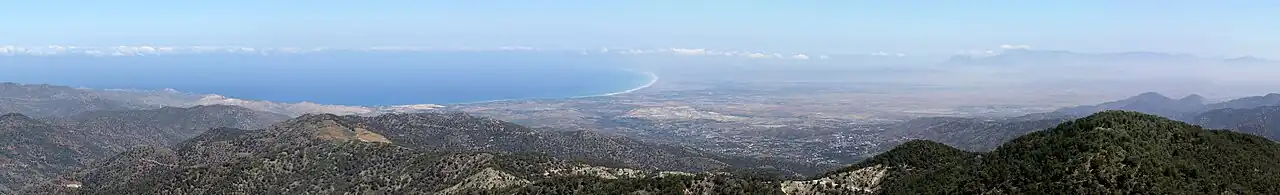 Panoramic view of the Güzelyurt District, and Morphou Bay as seen from the Troodos mountains.