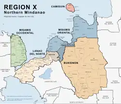 Northern Mindanao (Cebuano: Amihanang Mindanao; Maranao: Pangotaraan Mindanao; Filipino: Hilagang Mindanao), designated as Region X, is an administrative region in the Philippines. It comprises five provinces: Bukidnon, Camiguin, Misamis Occidental, Misamis Oriental, and Lanao del Norte, as well as two highly urbanized cities: Cagayan de Oro and Iligan, all occupying the northern-central part of Mindanao, including the island of Camiguin. The regional center and largest city is Cagayan de Oro.
