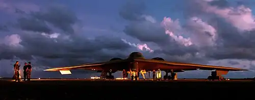 The Northrop B-2 Spirit is an American heavy strategic bomber that uses low-observable stealth technology to penetrate sophisticated anti-aircraft defenses. It is often referred to as a stealth bomber.[3][A]